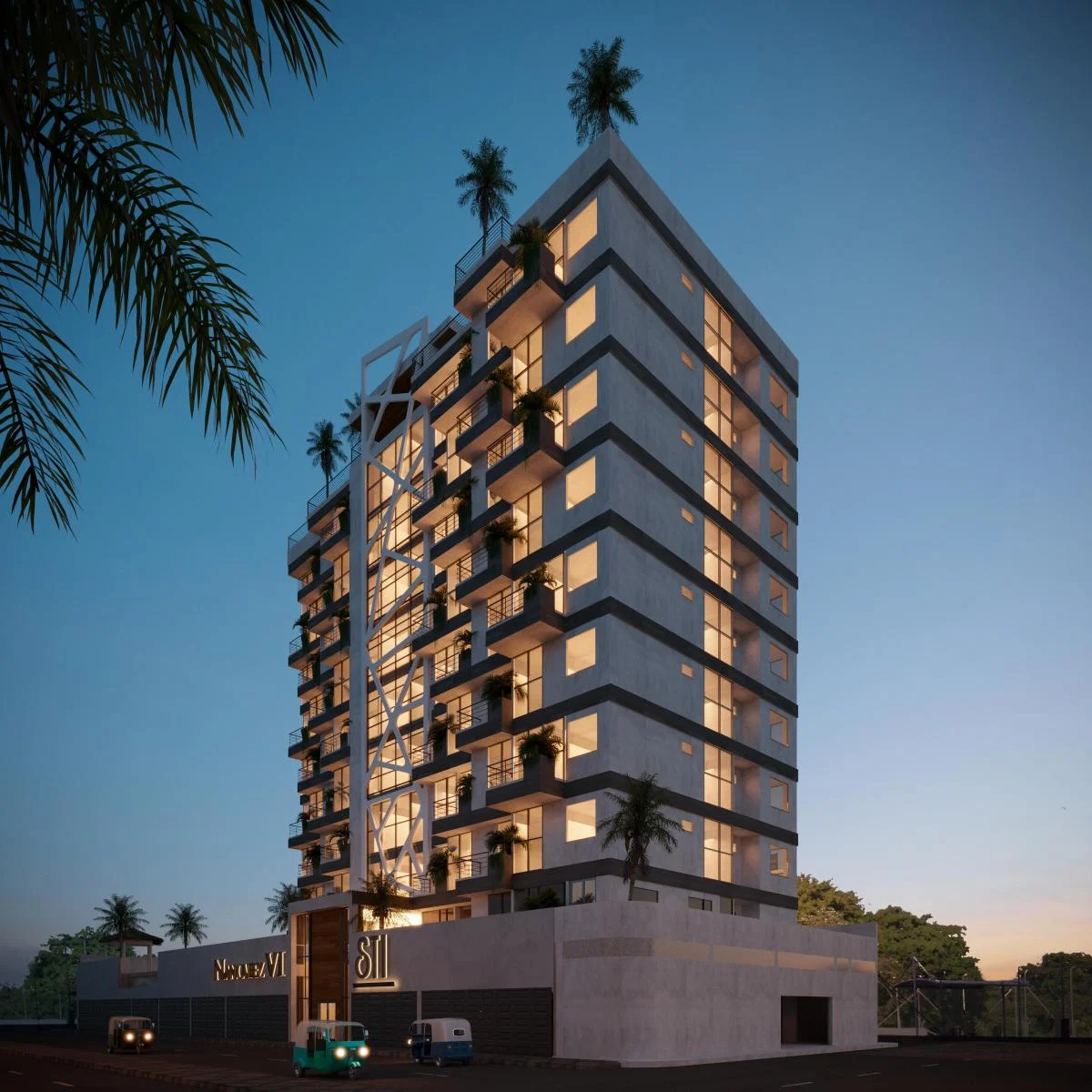 El edificio tiene 9 pisos con departamentos de 1, 2 y 3 habitaciones, además de planta baja y terraza panorámica. Su estructura es sismo resistente, cuenta con muros de corte estratégicos y entrepisos de hormigón alivianado. Es un edificio ecoeficiente, con balcones privados con vista al área social y al mar, ventanales amplios con mosquiteros y mobiliario de primera calidad. Dispone de transformador independiente, generador de luz, dos ascensores modernos, cisterna de 80 m³, cámaras de seguridad, luces de emergencia y área para guardianía.