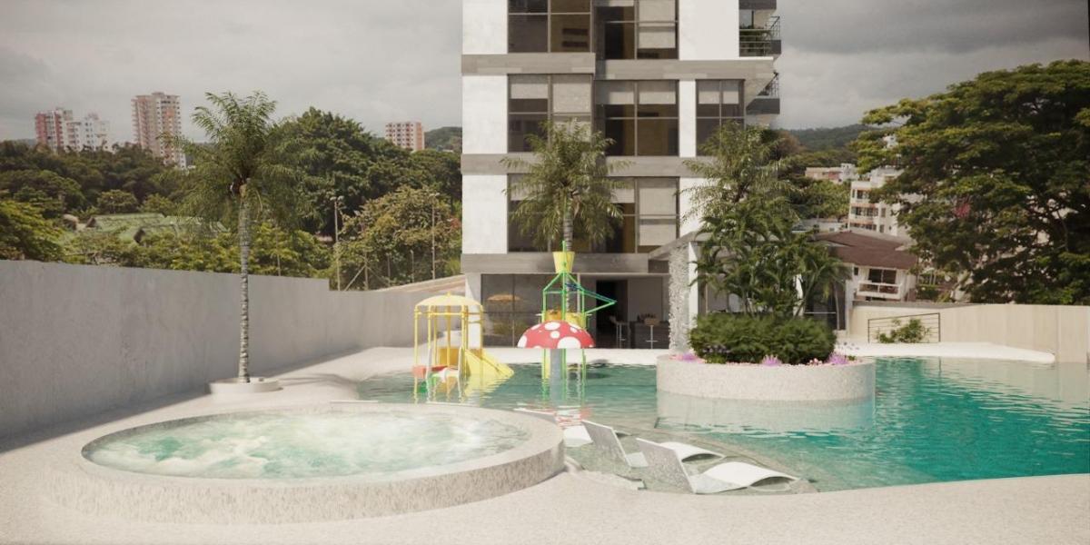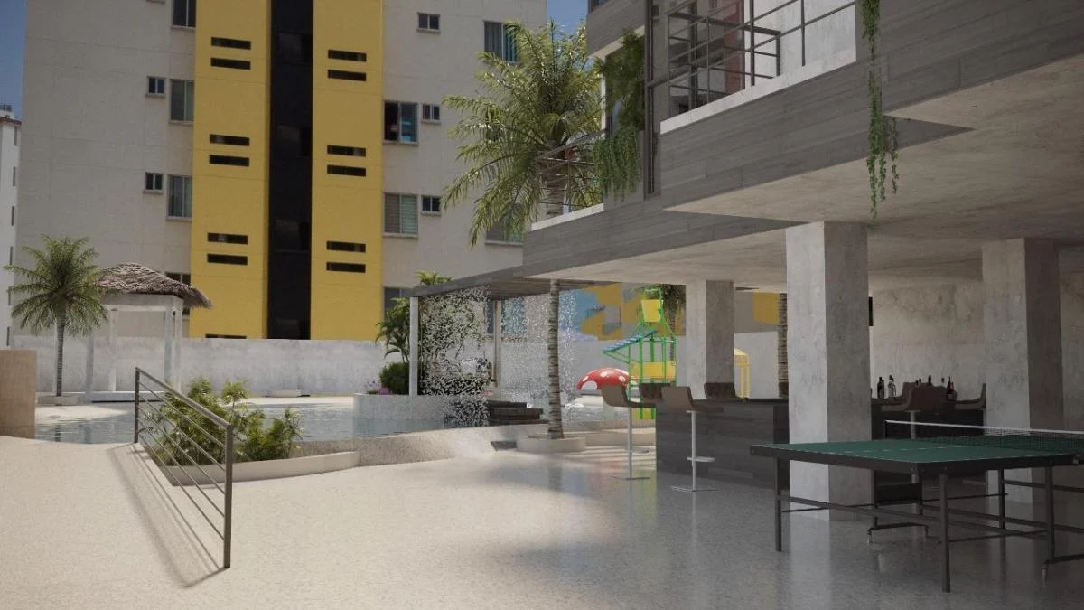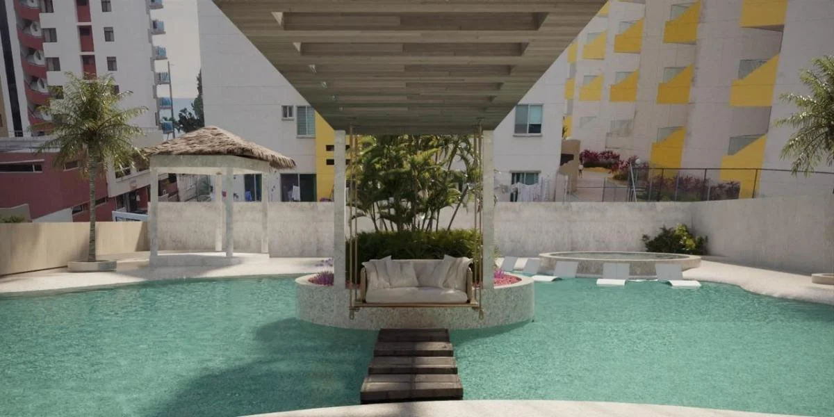 – Piscinas tipo oasis para adultos y niños con ingreso tipo playa, hidromasaje, parque acuático, isla temática, senderos, bar, juegos de mesa, chozón, sauna, turco, duchas, baños sociales y áreas verdes.